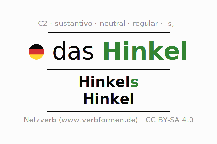 La declinación del sustantivoHinkel (gallina, gallinita) se encuentra en genitivoHinkels del singular y en el nominativoHinkel del plural. El sustantivo Hinkel se conjuga de forma fuerte (irregular) con estas terminaciones s/-. El género gramatical de Hinkel es neutro y por eso se requiere el artículo definido ‘das’. Aquí puedes declinar no solamente Hinkel sino también todos los sustantivos alemanes . Este sustantivo pertenece al vocabulario necesario para pasar el examen "Zertifikat Deutsch" o para el nivel C2. Comentarios ☆