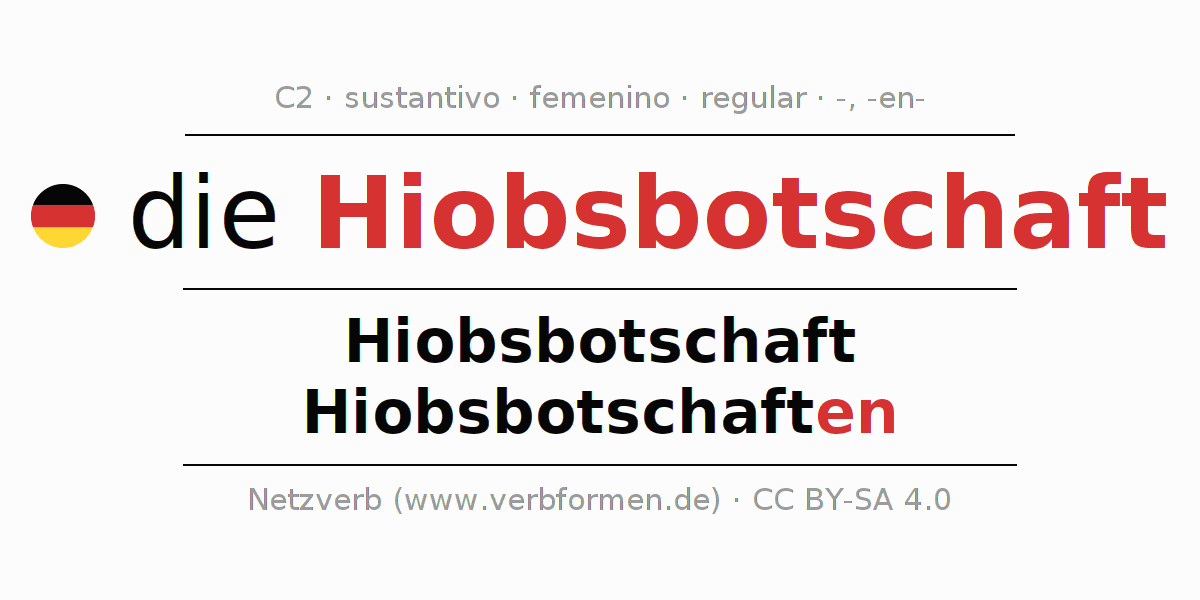 La declinación del sustantivo en forma de tabla con todas su formas: singular, plural y en los cuatro casos: nominativo (primer caso), genitivo (segundo caso), dativo (tercer caso) y acusativo (cuarto caso). Las construcciones gramaticales están representadas de forma clara en una tabla sinópica. La inflexión de los sustantivos es una ayuda durante tareas, exámenes, para cursos de alemán, la universidad, el estudio del alemán como lengua extranjera o como segundo idioma y para estudiantes adultos. La declinación correcta de las palabras es especialmente importante para los que aprenden el idioma alemán. Aquí encontraras más información acerca del tema Wiktionary Hiobsbotschaft y aquí también a través del Duden Hiobsbotschaft.
