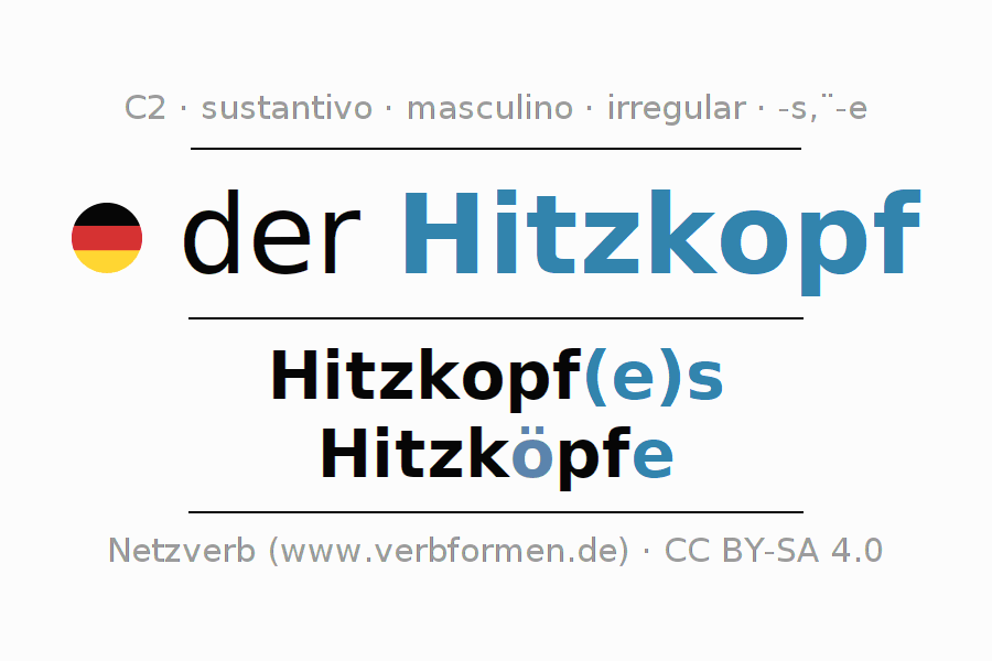 La declinación del sustantivo en forma de tabla con todas su formas: singular, plural y en los cuatro casos: nominativo (primer caso), genitivo (segundo caso), dativo (tercer caso) y acusativo (cuarto caso). Las construcciones gramaticales están representadas de forma clara en una tabla sinópica. La inflexión de los sustantivos es una ayuda durante tareas, exámenes, para cursos de alemán, la universidad, el estudio del alemán como lengua extranjera o como segundo idioma y para estudiantes adultos. La declinación correcta de las palabras es especialmente importante para los que aprenden el idioma alemán. Aquí encontraras más información acerca del tema Wiktionary Hitzkopf y aquí también a través del Duden Hitzkopf.