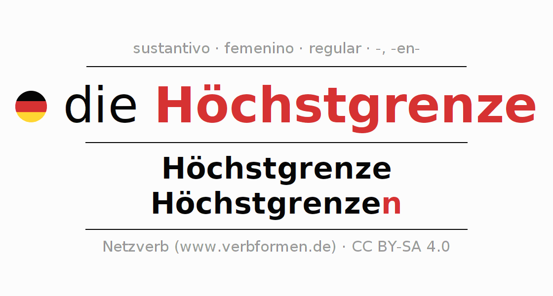La declinación del sustantivo en forma de tabla con todas su formas: singular, plural y en los cuatro casos: nominativo (primer caso), genitivo (segundo caso), dativo (tercer caso) y acusativo (cuarto caso). Las construcciones gramaticales están representadas de forma clara en una tabla sinópica. La inflexión de los sustantivos es una ayuda durante tareas, exámenes, para cursos de alemán, la universidad, el estudio del alemán como lengua extranjera o como segundo idioma y para estudiantes adultos. La declinación correcta de las palabras es especialmente importante para los que aprenden el idioma alemán. Aquí encontraras más información acerca del tema Wiktionary Höchstgrenze y aquí también a través del Duden Höchstgrenze.