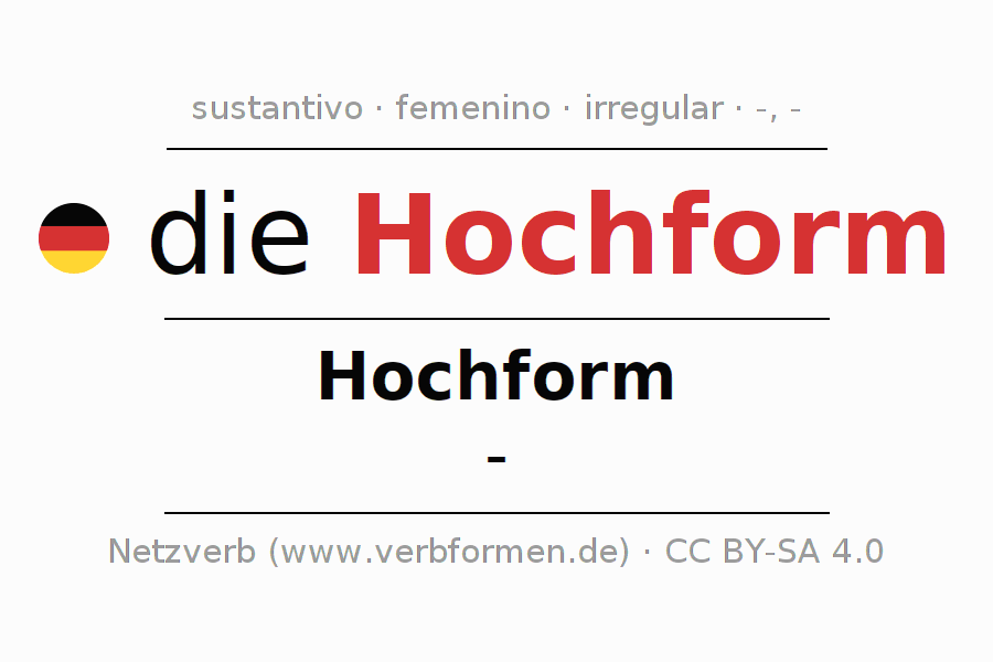 La declinación del sustantivoHochform (alto rendimiento, buena forma) se encuentra en genitivoHochform del singular y en el nominativo- del plural. El sustantivo Hochform se declina con las terminaciones -/-. No permite construcciones en plural. El género gramatical de Hochform es femenino y por eso se requiere el artículo definido ‘die’. Aquí puedes declinar no solamente Hochform sino también todos los sustantivos alemanes . Comentarios ☆
