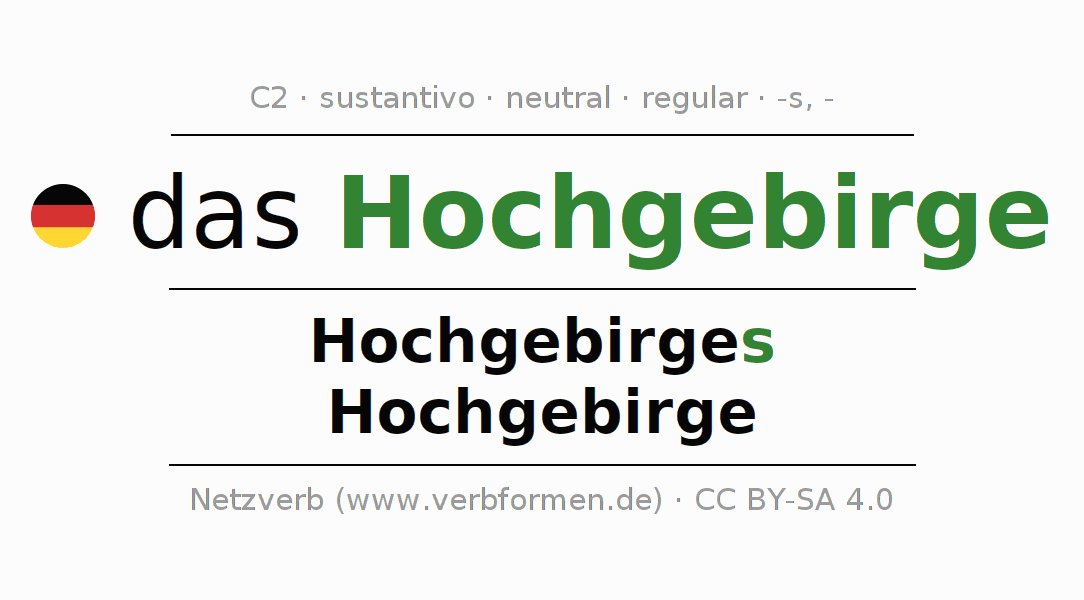 La declinación del sustantivo en forma de tabla con todas su formas: singular, plural y en los cuatro casos: nominativo (primer caso), genitivo (segundo caso), dativo (tercer caso) y acusativo (cuarto caso). Las construcciones gramaticales están representadas de forma clara en una tabla sinópica. La inflexión de los sustantivos es una ayuda durante tareas, exámenes, para cursos de alemán, la universidad, el estudio del alemán como lengua extranjera o como segundo idioma y para estudiantes adultos. La declinación correcta de las palabras es especialmente importante para los que aprenden el idioma alemán. Aquí encontraras más información acerca del tema Wiktionary Hochgebirge y aquí también a través del Duden Hochgebirge.