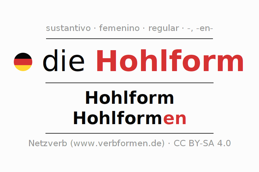 La declinación del sustantivo en forma de tabla con todas su formas: singular, plural y en los cuatro casos: nominativo (primer caso), genitivo (segundo caso), dativo (tercer caso) y acusativo (cuarto caso). Las construcciones gramaticales están representadas de forma clara en una tabla sinópica. La inflexión de los sustantivos es una ayuda durante tareas, exámenes, para cursos de alemán, la universidad, el estudio del alemán como lengua extranjera o como segundo idioma y para estudiantes adultos. La declinación correcta de las palabras es especialmente importante para los que aprenden el idioma alemán. Aquí encontraras más información acerca del tema Wiktionary Hohlform y aquí también a través del Duden Hohlform.