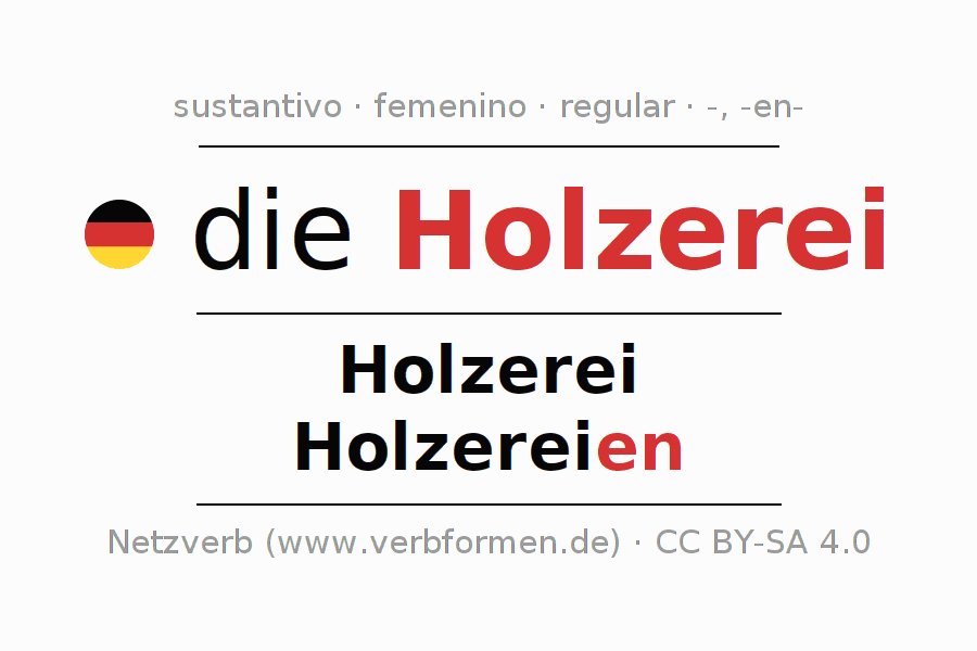 La declinación del sustantivo en forma de tabla con todas su formas: singular, plural y en los cuatro casos: nominativo (primer caso), genitivo (segundo caso), dativo (tercer caso) y acusativo (cuarto caso). Las construcciones gramaticales están representadas de forma clara en una tabla sinópica. La inflexión de los sustantivos es una ayuda durante tareas, exámenes, para cursos de alemán, la universidad, el estudio del alemán como lengua extranjera o como segundo idioma y para estudiantes adultos. La declinación correcta de las palabras es especialmente importante para los que aprenden el idioma alemán. Aquí encontraras más información acerca del tema Wiktionary Holzerei y aquí también a través del Duden Holzerei.