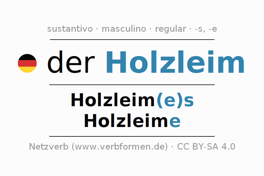 La declinación del sustantivo en forma de tabla con todas su formas: singular, plural y en los cuatro casos: nominativo (primer caso), genitivo (segundo caso), dativo (tercer caso) y acusativo (cuarto caso). Las construcciones gramaticales están representadas de forma clara en una tabla sinópica. La inflexión de los sustantivos es una ayuda durante tareas, exámenes, para cursos de alemán, la universidad, el estudio del alemán como lengua extranjera o como segundo idioma y para estudiantes adultos. La declinación correcta de las palabras es especialmente importante para los que aprenden el idioma alemán. Aquí encontraras más información acerca del tema Wiktionary Holzleim y aquí también a través del Duden Holzleim.