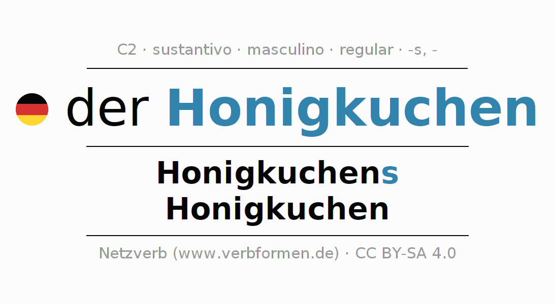 La declinación del sustantivo en forma de tabla con todas su formas: singular, plural y en los cuatro casos: nominativo (primer caso), genitivo (segundo caso), dativo (tercer caso) y acusativo (cuarto caso). Las construcciones gramaticales están representadas de forma clara en una tabla sinópica. La inflexión de los sustantivos es una ayuda durante tareas, exámenes, para cursos de alemán, la universidad, el estudio del alemán como lengua extranjera o como segundo idioma y para estudiantes adultos. La declinación correcta de las palabras es especialmente importante para los que aprenden el idioma alemán. Aquí encontraras más información acerca del tema Wiktionary Honigkuchen y aquí también a través del Duden Honigkuchen.