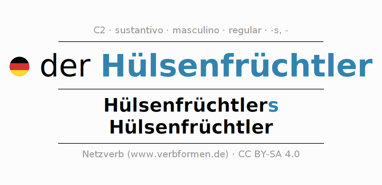 La declinación del sustantivo en forma de tabla con todas su formas: singular, plural y en los cuatro casos: nominativo (primer caso), genitivo (segundo caso), dativo (tercer caso) y acusativo (cuarto caso). Las construcciones gramaticales están representadas de forma clara en una tabla sinópica. La inflexión de los sustantivos es una ayuda durante tareas, exámenes, para cursos de alemán, la universidad, el estudio del alemán como lengua extranjera o como segundo idioma y para estudiantes adultos. La declinación correcta de las palabras es especialmente importante para los que aprenden el idioma alemán. Aquí encontraras más información acerca del tema Wiktionary Hülsenfrüchtler y aquí también a través del Duden Hülsenfrüchtler.
