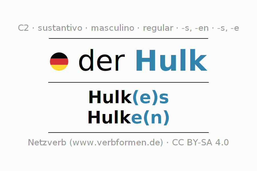 La declinación del sustantivo en forma de tabla con todas su formas: singular, plural y en los cuatro casos: nominativo (primer caso), genitivo (segundo caso), dativo (tercer caso) y acusativo (cuarto caso). Las construcciones gramaticales están representadas de forma clara en una tabla sinópica. La inflexión de los sustantivos es una ayuda durante tareas, exámenes, para cursos de alemán, la universidad, el estudio del alemán como lengua extranjera o como segundo idioma y para estudiantes adultos. La declinación correcta de las palabras es especialmente importante para los que aprenden el idioma alemán. Aquí encontraras más información acerca del tema Wiktionary Hulk y aquí también a través del Duden Hulk.