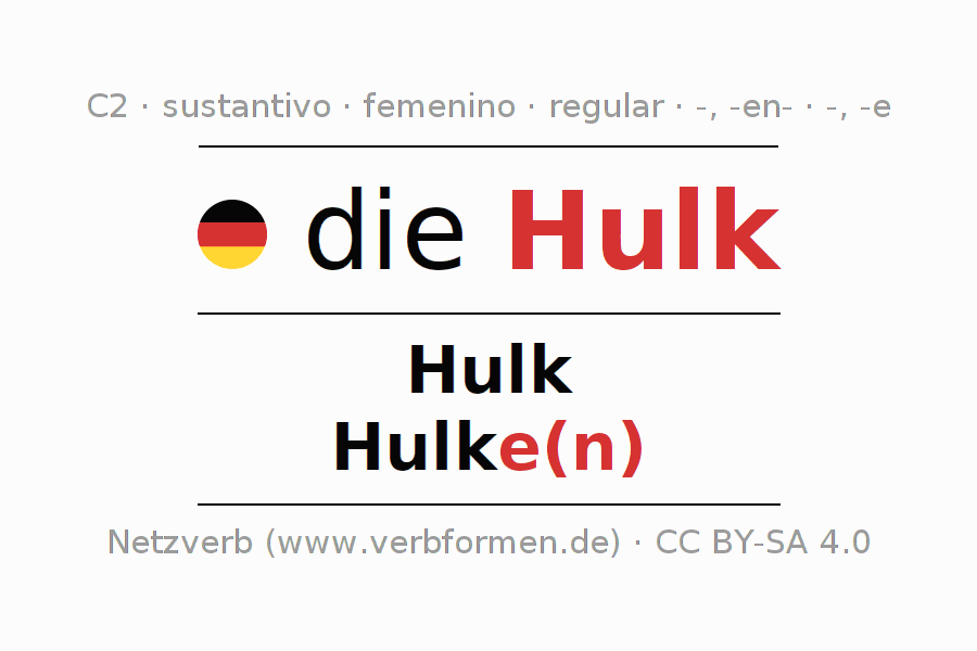 La declinación del sustantivo en forma de tabla con todas su formas: singular, plural y en los cuatro casos: nominativo (primer caso), genitivo (segundo caso), dativo (tercer caso) y acusativo (cuarto caso). Las construcciones gramaticales están representadas de forma clara en una tabla sinópica. La inflexión de los sustantivos es una ayuda durante tareas, exámenes, para cursos de alemán, la universidad, el estudio del alemán como lengua extranjera o como segundo idioma y para estudiantes adultos. La declinación correcta de las palabras es especialmente importante para los que aprenden el idioma alemán. Aquí encontraras más información acerca del tema Wiktionary die Hulk y aquí también a través del Duden die Hulk.