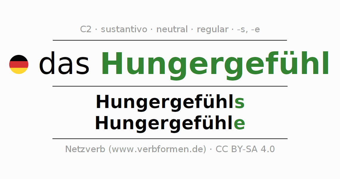 La declinación del sustantivo en forma de tabla con todas su formas: singular, plural y en los cuatro casos: nominativo (primer caso), genitivo (segundo caso), dativo (tercer caso) y acusativo (cuarto caso). Las construcciones gramaticales están representadas de forma clara en una tabla sinópica. La inflexión de los sustantivos es una ayuda durante tareas, exámenes, para cursos de alemán, la universidad, el estudio del alemán como lengua extranjera o como segundo idioma y para estudiantes adultos. La declinación correcta de las palabras es especialmente importante para los que aprenden el idioma alemán. Aquí encontraras más información acerca del tema Wiktionary Hungergefühl y aquí también a través del Duden Hungergefühl.