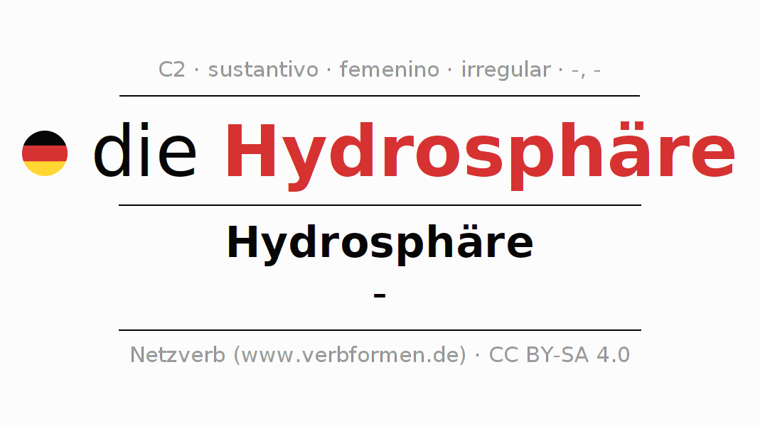 La declinación del sustantivoHydrosphäre (hidrosfera) se encuentra en genitivoHydrosphäre del singular y en el nominativo- del plural. El sustantivo Hydrosphäre se declina con las terminaciones -/-. No permite construcciones en plural. El género gramatical de Hydrosphäre es femenino y por eso se requiere el artículo definido ‘die’. Aquí puedes declinar no solamente Hydrosphäre sino también todos los sustantivos alemanes . Este sustantivo pertenece al vocabulario necesario para pasar el examen "Zertifikat Deutsch" o para el nivel C2. Comentarios ☆