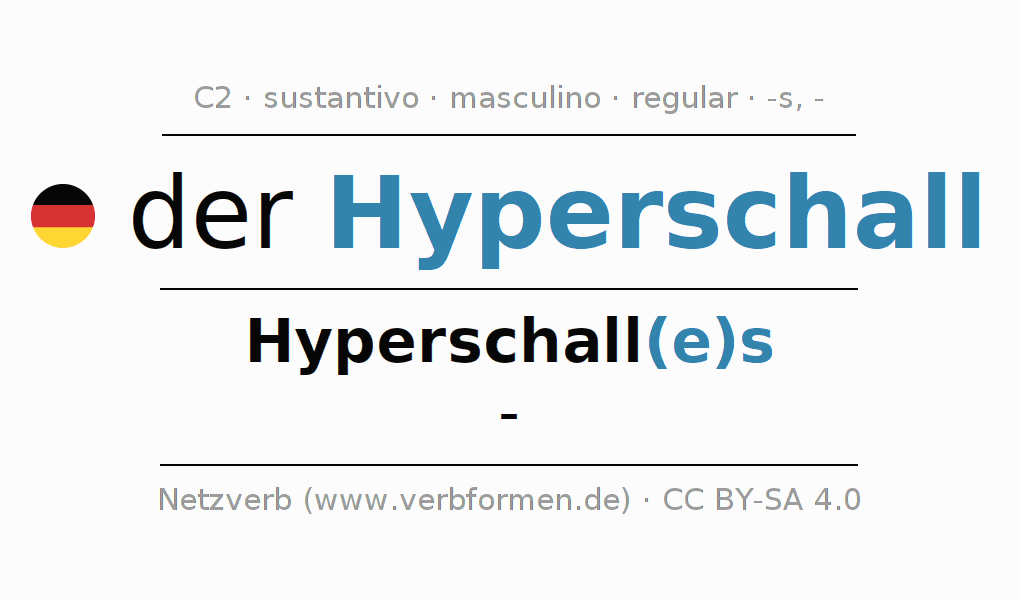 La declinación del sustantivoHyperschall (hipersónico) se encuentra en genitivoHyperschall(e)s del singular y en el nominativo- del plural. El sustantivo Hyperschall se conjuga de forma fuerte (irregular) con estas terminaciones es/-. No permite construcciones en plural. El género gramatical de Hyperschall es masculino y por eso se requiere el artículo definido ‘der’. Aquí puedes declinar no solamente Hyperschall sino también todos los sustantivos alemanes . Este sustantivo pertenece al vocabulario necesario para pasar el examen "Zertifikat Deutsch" o para el nivel C2. Comentarios ☆
