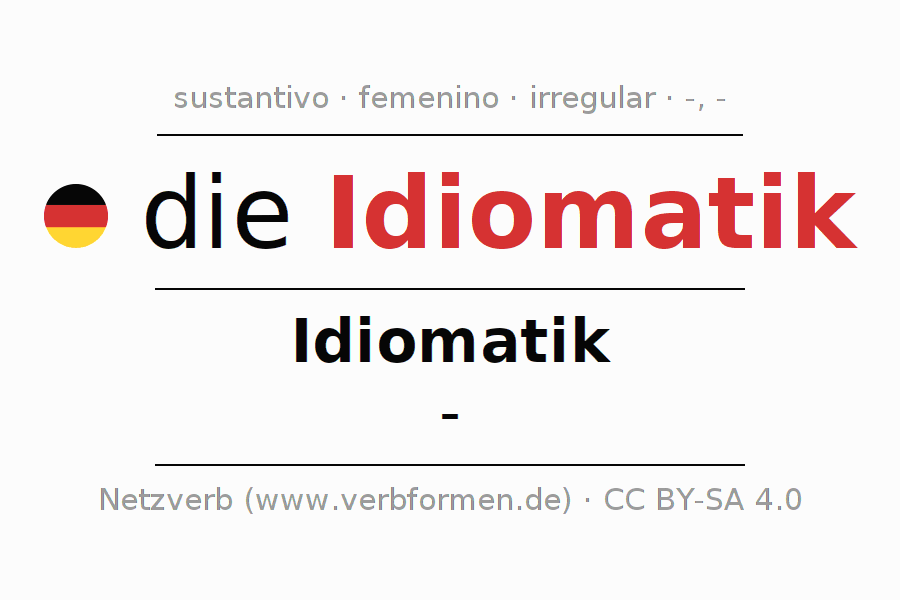 La declinación del sustantivoIdiomatik (idiomatismo) se encuentra en genitivoIdiomatik del singular y en el nominativo- del plural. El sustantivo Idiomatik se declina con las terminaciones -/-. No permite construcciones en plural. El género gramatical de Idiomatik es femenino y por eso se requiere el artículo definido ‘die’. Aquí puedes declinar no solamente Idiomatik sino también todos los sustantivos alemanes . Comentarios ☆