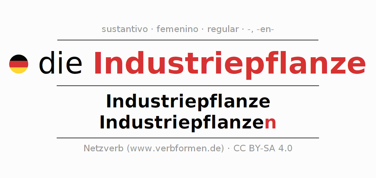 La declinación del sustantivo en forma de tabla con todas su formas: singular, plural y en los cuatro casos: nominativo (primer caso), genitivo (segundo caso), dativo (tercer caso) y acusativo (cuarto caso). Las construcciones gramaticales están representadas de forma clara en una tabla sinópica. La inflexión de los sustantivos es una ayuda durante tareas, exámenes, para cursos de alemán, la universidad, el estudio del alemán como lengua extranjera o como segundo idioma y para estudiantes adultos. La declinación correcta de las palabras es especialmente importante para los que aprenden el idioma alemán. Aquí encontraras más información acerca del tema Wiktionary Industriepflanze y aquí también a través del Duden Industriepflanze.