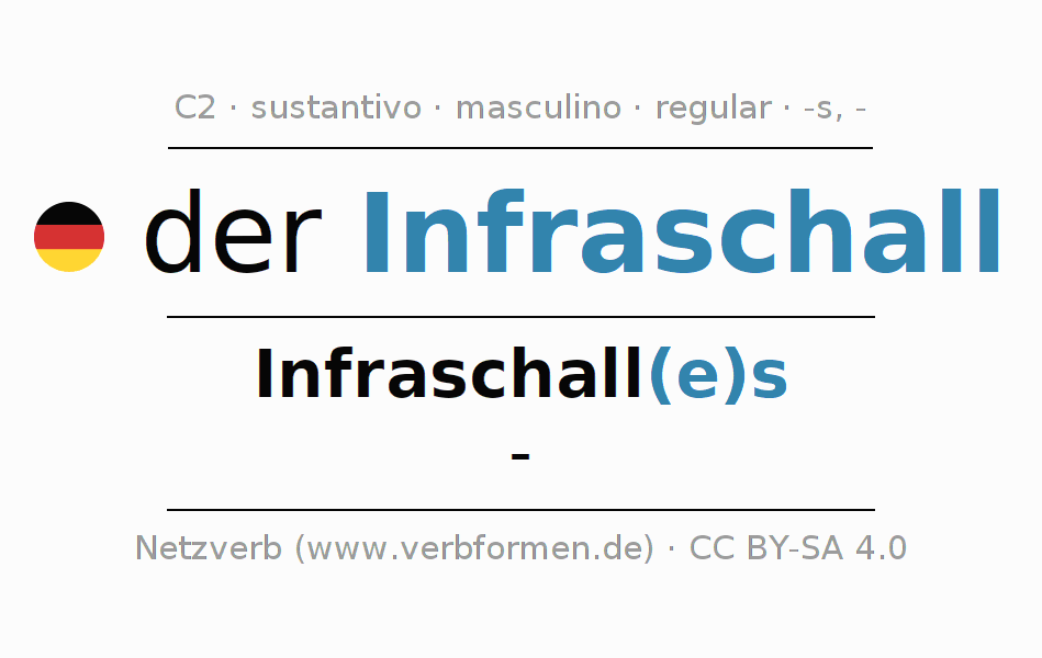 La declinación del sustantivo en forma de tabla con todas su formas: singular, plural y en los cuatro casos: nominativo (primer caso), genitivo (segundo caso), dativo (tercer caso) y acusativo (cuarto caso). Las construcciones gramaticales están representadas de forma clara en una tabla sinópica. La inflexión de los sustantivos es una ayuda durante tareas, exámenes, para cursos de alemán, la universidad, el estudio del alemán como lengua extranjera o como segundo idioma y para estudiantes adultos. La declinación correcta de las palabras es especialmente importante para los que aprenden el idioma alemán. Aquí encontraras más información acerca del tema Wiktionary Infraschall y aquí también a través del Duden Infraschall.