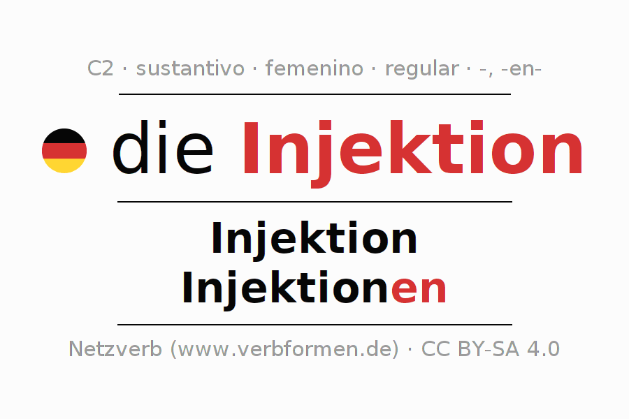 La declinación del sustantivoInjektion (inyección, inyección de combustible) se encuentra en genitivoInjektion del singular y en el nominativoInjektionen del plural. El sustantivo Injektion se declina de forma débil con las terminaciones -/en. El género gramatical de Injektion es femenino y por eso se requiere el artículo definido ‘die’. Aquí puedes declinar no solamente Injektion sino también todos los sustantivos alemanes . Este sustantivo pertenece al vocabulario necesario para pasar el examen "Zertifikat Deutsch" o para el nivel C2. Comentarios ☆