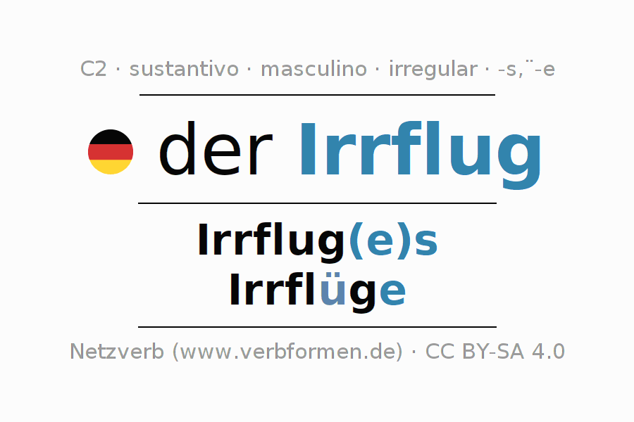 La declinación del sustantivo en forma de tabla con todas su formas: singular, plural y en los cuatro casos: nominativo (primer caso), genitivo (segundo caso), dativo (tercer caso) y acusativo (cuarto caso). Las construcciones gramaticales están representadas de forma clara en una tabla sinópica. La inflexión de los sustantivos es una ayuda durante tareas, exámenes, para cursos de alemán, la universidad, el estudio del alemán como lengua extranjera o como segundo idioma y para estudiantes adultos. La declinación correcta de las palabras es especialmente importante para los que aprenden el idioma alemán. Aquí encontraras más información acerca del tema Wiktionary Irrflug y aquí también a través del Duden Irrflug.