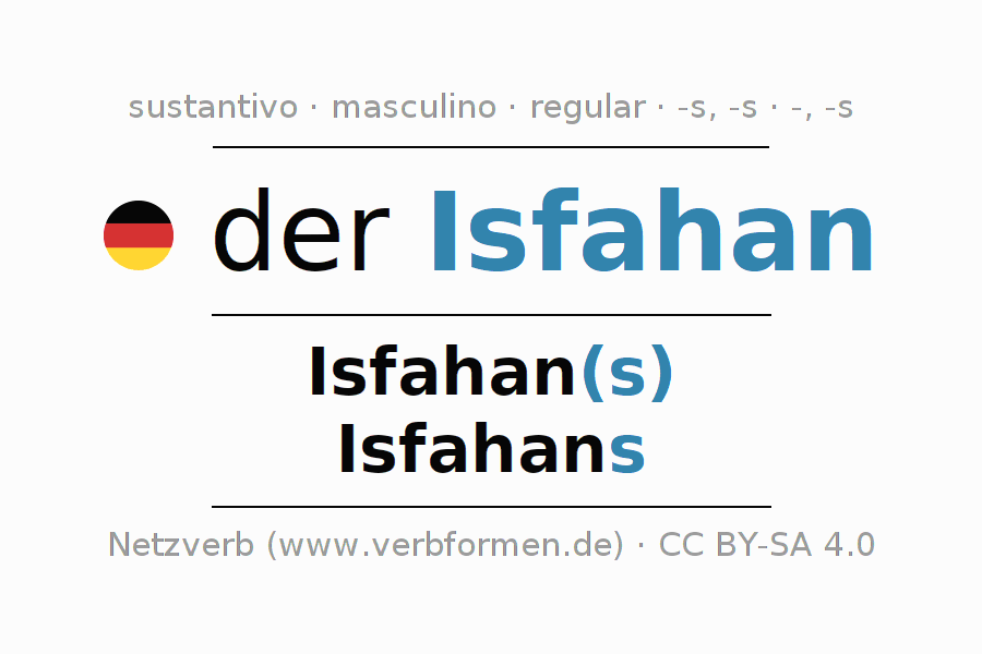 La declinación del sustantivoIsfahan (Isfahán) se encuentra en genitivoIsfahan(s) del singular y en el nominativoIsfahans del plural. El sustantivo Isfahan se conjuga de forma fuerte (irregular) con estas terminaciones s/-/s. El género gramatical de Isfahan es masculino y por eso se requiere el artículo definido ‘der’. Aquí puedes declinar no solamente Isfahan sino también todos los sustantivos alemanes . Comentarios ☆