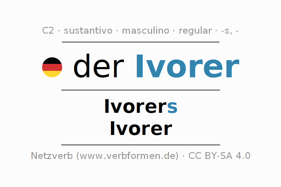 La declinación del sustantivo en forma de tabla con todas su formas: singular, plural y en los cuatro casos: nominativo (primer caso), genitivo (segundo caso), dativo (tercer caso) y acusativo (cuarto caso). Las construcciones gramaticales están representadas de forma clara en una tabla sinópica. La inflexión de los sustantivos es una ayuda durante tareas, exámenes, para cursos de alemán, la universidad, el estudio del alemán como lengua extranjera o como segundo idioma y para estudiantes adultos. La declinación correcta de las palabras es especialmente importante para los que aprenden el idioma alemán. Aquí encontraras más información acerca del tema Wiktionary Ivorer y aquí también a través del Duden Ivorer.