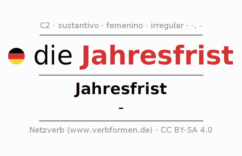 La declinación del sustantivoJahresfrist (período anual, plazo anual) se encuentra en genitivoJahresfrist del singular y en el nominativo- del plural. El sustantivo Jahresfrist se declina con las terminaciones -/-. No permite construcciones en plural. El género gramatical de Jahresfrist es femenino y por eso se requiere el artículo definido ‘die’. Aquí puedes declinar no solamente Jahresfrist sino también todos los sustantivos alemanes . Este sustantivo pertenece al vocabulario necesario para pasar el examen "Zertifikat Deutsch" o para el nivel C2. Comentarios ☆