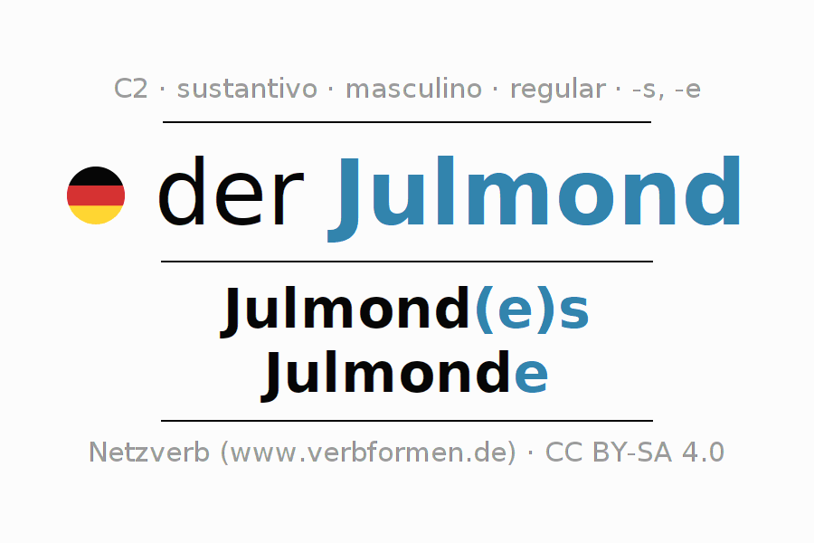La declinación del sustantivo en forma de tabla con todas su formas: singular, plural y en los cuatro casos: nominativo (primer caso), genitivo (segundo caso), dativo (tercer caso) y acusativo (cuarto caso). Las construcciones gramaticales están representadas de forma clara en una tabla sinópica. La inflexión de los sustantivos es una ayuda durante tareas, exámenes, para cursos de alemán, la universidad, el estudio del alemán como lengua extranjera o como segundo idioma y para estudiantes adultos. La declinación correcta de las palabras es especialmente importante para los que aprenden el idioma alemán. Aquí encontraras más información acerca del tema Wiktionary Julmond y aquí también a través del Duden Julmond.