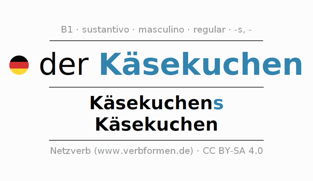 La declinación del sustantivo en forma de tabla con todas su formas: singular, plural y en los cuatro casos: nominativo (primer caso), genitivo (segundo caso), dativo (tercer caso) y acusativo (cuarto caso). Las construcciones gramaticales están representadas de forma clara en una tabla sinópica. La inflexión de los sustantivos es una ayuda durante tareas, exámenes, para cursos de alemán, la universidad, el estudio del alemán como lengua extranjera o como segundo idioma y para estudiantes adultos. La declinación correcta de las palabras es especialmente importante para los que aprenden el idioma alemán. Aquí encontraras más información acerca del tema Wiktionary Käsekuchen y aquí también a través del Duden Käsekuchen.
