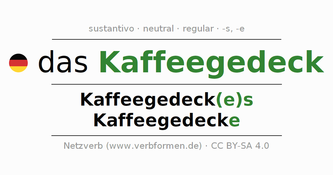 La declinación del sustantivo en forma de tabla con todas su formas: singular, plural y en los cuatro casos: nominativo (primer caso), genitivo (segundo caso), dativo (tercer caso) y acusativo (cuarto caso). Las construcciones gramaticales están representadas de forma clara en una tabla sinópica. La inflexión de los sustantivos es una ayuda durante tareas, exámenes, para cursos de alemán, la universidad, el estudio del alemán como lengua extranjera o como segundo idioma y para estudiantes adultos. La declinación correcta de las palabras es especialmente importante para los que aprenden el idioma alemán. Aquí encontraras más información acerca del tema Wiktionary Kaffeegedeck y aquí también a través del Duden Kaffeegedeck.