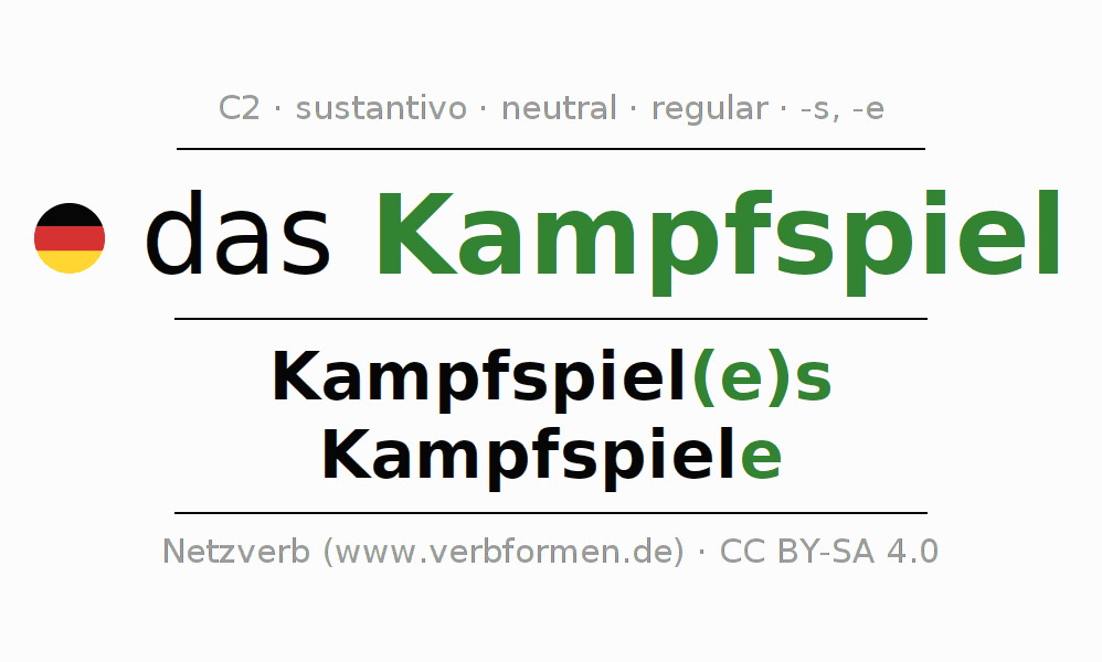La declinación del sustantivo en forma de tabla con todas su formas: singular, plural y en los cuatro casos: nominativo (primer caso), genitivo (segundo caso), dativo (tercer caso) y acusativo (cuarto caso). Las construcciones gramaticales están representadas de forma clara en una tabla sinópica. La inflexión de los sustantivos es una ayuda durante tareas, exámenes, para cursos de alemán, la universidad, el estudio del alemán como lengua extranjera o como segundo idioma y para estudiantes adultos. La declinación correcta de las palabras es especialmente importante para los que aprenden el idioma alemán. Aquí encontraras más información acerca del tema Wiktionary Kampfspiel y aquí también a través del Duden Kampfspiel.