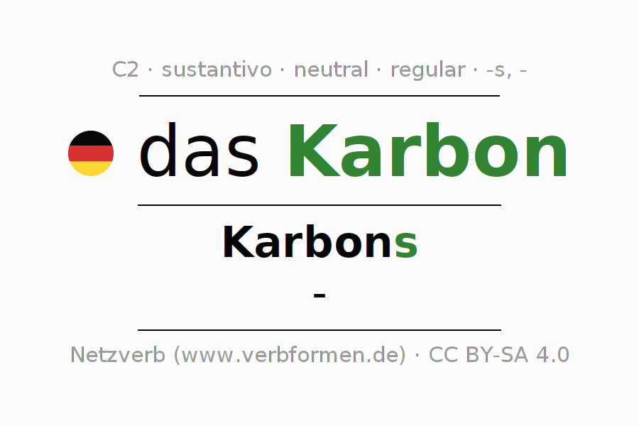 La declinación del sustantivoKarbon (carbon, carbonífero) se encuentra en genitivoKarbons del singular y en el nominativo- del plural. El sustantivo Karbon se conjuga de forma fuerte (irregular) con estas terminaciones s/-. No permite construcciones en plural. El género gramatical de Karbon es neutro y por eso se requiere el artículo definido ‘das’. Aquí puedes declinar no solamente Karbon sino también todos los sustantivos alemanes . Este sustantivo pertenece al vocabulario necesario para pasar el examen "Zertifikat Deutsch" o para el nivel C2. Comentarios ☆