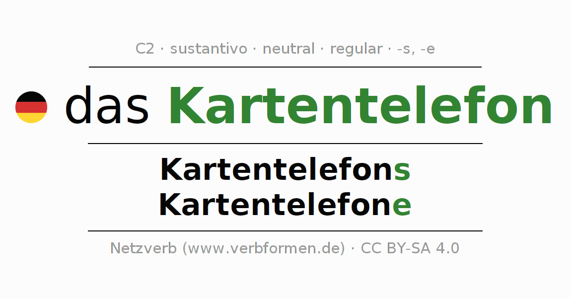 La declinación del sustantivoKartentelefon (tarjeta telefónica) se encuentra en genitivoKartentelefons del singular y en el nominativoKartentelefone del plural. El sustantivo Kartentelefon se conjuga de forma fuerte (irregular) con estas terminaciones s/e. El género gramatical de Kartentelefon es neutro y por eso se requiere el artículo definido ‘das’. Aquí puedes declinar no solamente Kartentelefon sino también todos los sustantivos alemanes . Este sustantivo pertenece al vocabulario necesario para pasar el examen "Zertifikat Deutsch" o para el nivel C2. Comentarios ☆