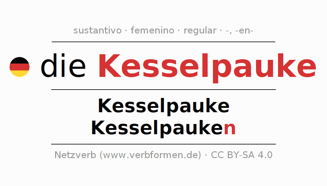 La declinación del sustantivo en forma de tabla con todas su formas: singular, plural y en los cuatro casos: nominativo (primer caso), genitivo (segundo caso), dativo (tercer caso) y acusativo (cuarto caso). Las construcciones gramaticales están representadas de forma clara en una tabla sinópica. La inflexión de los sustantivos es una ayuda durante tareas, exámenes, para cursos de alemán, la universidad, el estudio del alemán como lengua extranjera o como segundo idioma y para estudiantes adultos. La declinación correcta de las palabras es especialmente importante para los que aprenden el idioma alemán. Aquí encontraras más información acerca del tema Wiktionary Kesselpauke y aquí también a través del Duden Kesselpauke.