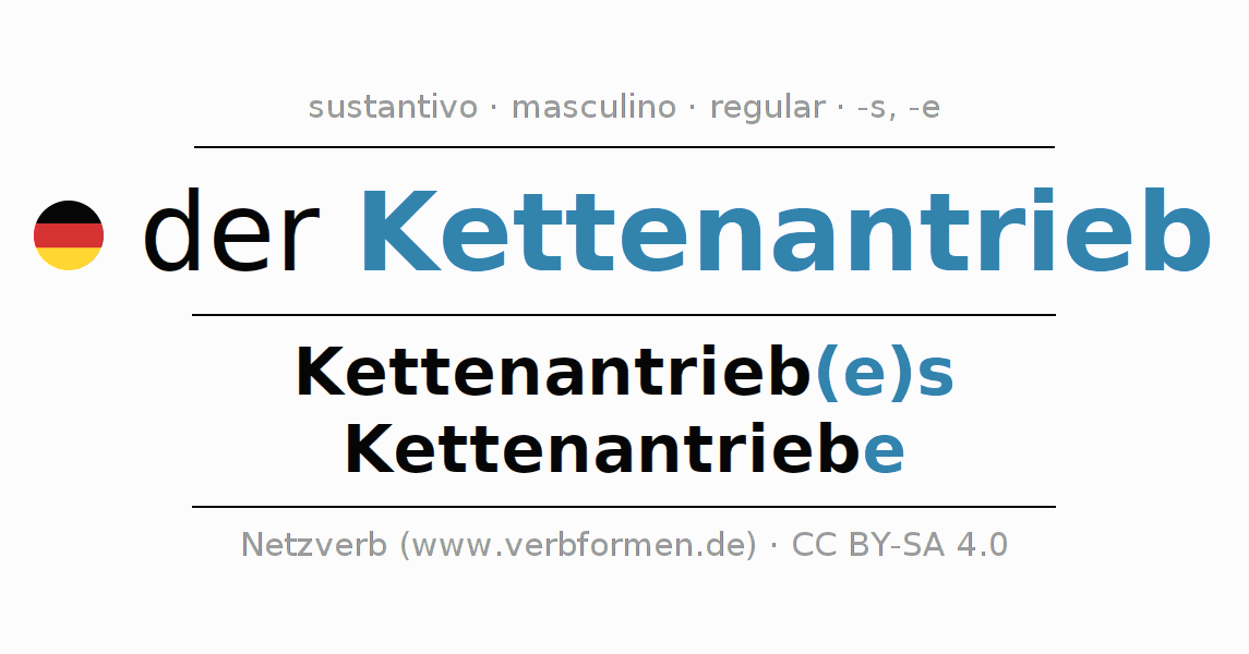 La declinación del sustantivo en forma de tabla con todas su formas: singular, plural y en los cuatro casos: nominativo (primer caso), genitivo (segundo caso), dativo (tercer caso) y acusativo (cuarto caso). Las construcciones gramaticales están representadas de forma clara en una tabla sinópica. La inflexión de los sustantivos es una ayuda durante tareas, exámenes, para cursos de alemán, la universidad, el estudio del alemán como lengua extranjera o como segundo idioma y para estudiantes adultos. La declinación correcta de las palabras es especialmente importante para los que aprenden el idioma alemán. Aquí encontraras más información acerca del tema Wiktionary Kettenantrieb y aquí también a través del Duden Kettenantrieb.