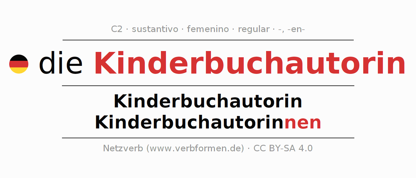 La declinación del sustantivo en forma de tabla con todas su formas: singular, plural y en los cuatro casos: nominativo (primer caso), genitivo (segundo caso), dativo (tercer caso) y acusativo (cuarto caso). Las construcciones gramaticales están representadas de forma clara en una tabla sinópica. La inflexión de los sustantivos es una ayuda durante tareas, exámenes, para cursos de alemán, la universidad, el estudio del alemán como lengua extranjera o como segundo idioma y para estudiantes adultos. La declinación correcta de las palabras es especialmente importante para los que aprenden el idioma alemán. Aquí encontraras más información acerca del tema Wiktionary Kinderbuchautorin y aquí también a través del Duden Kinderbuchautorin.