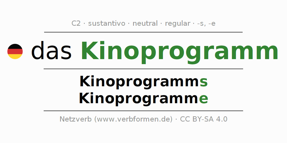 La declinación del sustantivo en forma de tabla con todas su formas: singular, plural y en los cuatro casos: nominativo (primer caso), genitivo (segundo caso), dativo (tercer caso) y acusativo (cuarto caso). Las construcciones gramaticales están representadas de forma clara en una tabla sinópica. La inflexión de los sustantivos es una ayuda durante tareas, exámenes, para cursos de alemán, la universidad, el estudio del alemán como lengua extranjera o como segundo idioma y para estudiantes adultos. La declinación correcta de las palabras es especialmente importante para los que aprenden el idioma alemán. Aquí encontraras más información acerca del tema Wiktionary Kinoprogramm y aquí también a través del Duden Kinoprogramm.