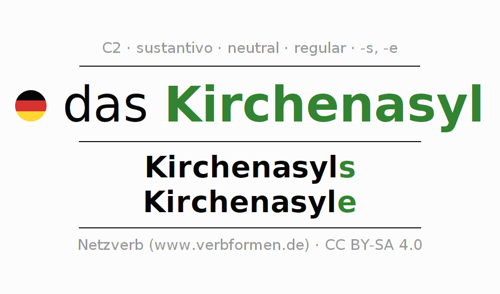La declinación del sustantivo en forma de tabla con todas su formas: singular, plural y en los cuatro casos: nominativo (primer caso), genitivo (segundo caso), dativo (tercer caso) y acusativo (cuarto caso). Las construcciones gramaticales están representadas de forma clara en una tabla sinópica. La inflexión de los sustantivos es una ayuda durante tareas, exámenes, para cursos de alemán, la universidad, el estudio del alemán como lengua extranjera o como segundo idioma y para estudiantes adultos. La declinación correcta de las palabras es especialmente importante para los que aprenden el idioma alemán. Aquí encontraras más información acerca del tema Wiktionary Kirchenasyl y aquí también a través del Duden Kirchenasyl.