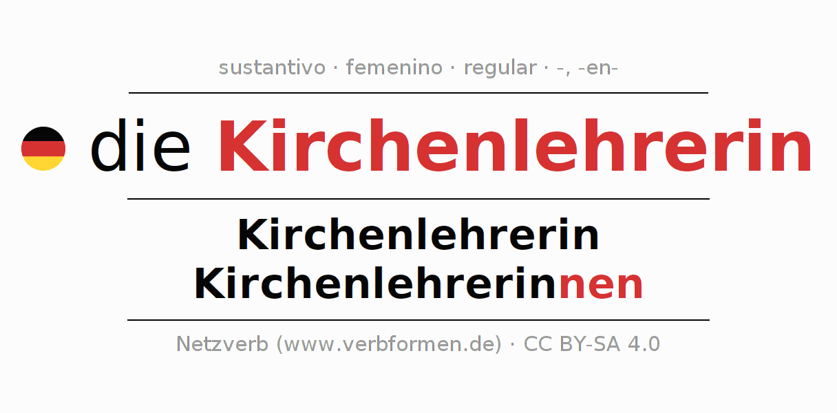 La declinación del sustantivo en forma de tabla con todas su formas: singular, plural y en los cuatro casos: nominativo (primer caso), genitivo (segundo caso), dativo (tercer caso) y acusativo (cuarto caso). Las construcciones gramaticales están representadas de forma clara en una tabla sinópica. La inflexión de los sustantivos es una ayuda durante tareas, exámenes, para cursos de alemán, la universidad, el estudio del alemán como lengua extranjera o como segundo idioma y para estudiantes adultos. La declinación correcta de las palabras es especialmente importante para los que aprenden el idioma alemán. Aquí encontraras más información acerca del tema Wiktionary Kirchenlehrerin y aquí también a través del Duden Kirchenlehrerin.