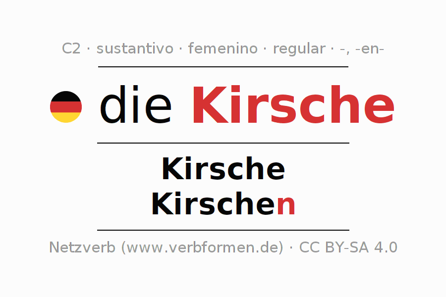 La declinación del sustantivo en forma de tabla con todas su formas: singular, plural y en los cuatro casos: nominativo (primer caso), genitivo (segundo caso), dativo (tercer caso) y acusativo (cuarto caso). Las construcciones gramaticales están representadas de forma clara en una tabla sinópica. La inflexión de los sustantivos es una ayuda durante tareas, exámenes, para cursos de alemán, la universidad, el estudio del alemán como lengua extranjera o como segundo idioma y para estudiantes adultos. La declinación correcta de las palabras es especialmente importante para los que aprenden el idioma alemán. Aquí encontraras más información acerca del tema Wiktionary Kirsche y aquí también a través del Duden Kirsche.