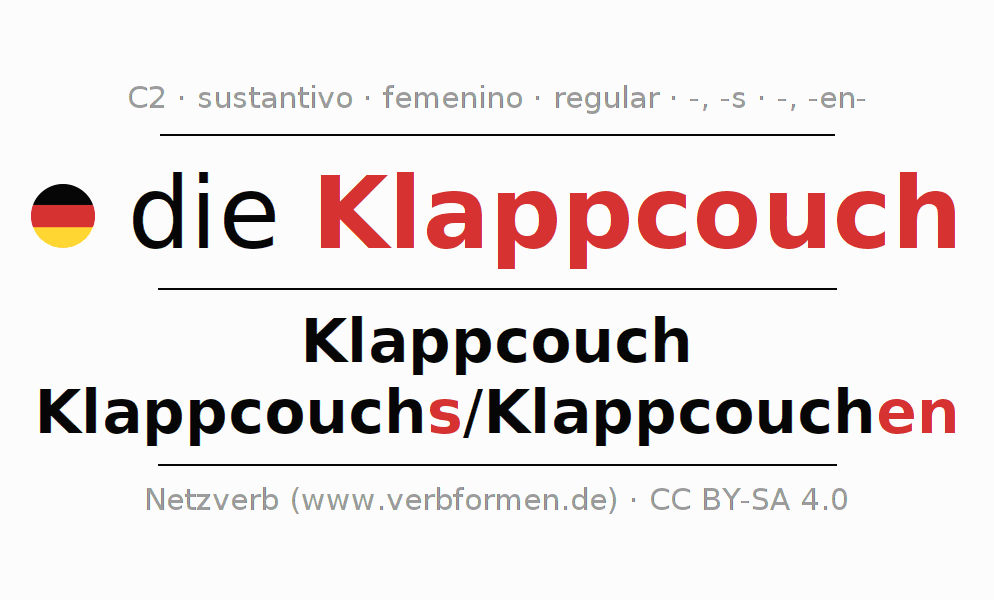 La declinación del sustantivoKlappcouch (sofá cama, cama plegable) se encuentra en genitivoKlappcouch del singular y en el nominativoKlappcouchs/Klappcouchen del plural. El sustantivo Klappcouch se conjuga de forma fuerte (irregular) con estas terminaciones -/s/en. El género gramatical de Klappcouch es femenino y por eso se requiere el artículo definido ‘die’. Aquí puedes declinar no solamente Klappcouch sino también todos los sustantivos alemanes . Este sustantivo pertenece al vocabulario necesario para pasar el examen "Zertifikat Deutsch" o para el nivel C2. Comentarios ☆