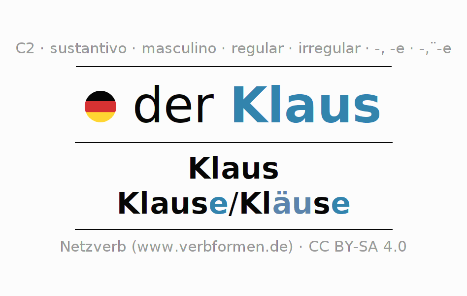 La declinación del sustantivo en forma de tabla con todas su formas: singular, plural y en los cuatro casos: nominativo (primer caso), genitivo (segundo caso), dativo (tercer caso) y acusativo (cuarto caso). Las construcciones gramaticales están representadas de forma clara en una tabla sinópica. La inflexión de los sustantivos es una ayuda durante tareas, exámenes, para cursos de alemán, la universidad, el estudio del alemán como lengua extranjera o como segundo idioma y para estudiantes adultos. La declinación correcta de las palabras es especialmente importante para los que aprenden el idioma alemán. Aquí encontraras más información acerca del tema Wiktionary Klaus y aquí también a través del Duden Klaus.