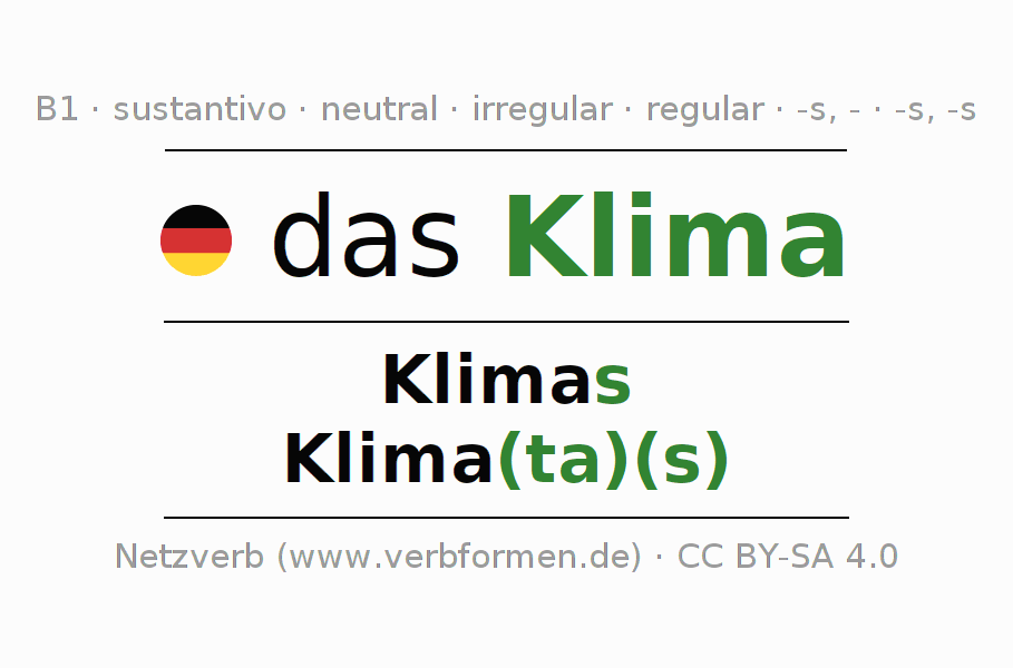 La declinación del sustantivo en forma de tabla con todas su formas: singular, plural y en los cuatro casos: nominativo (primer caso), genitivo (segundo caso), dativo (tercer caso) y acusativo (cuarto caso). Las construcciones gramaticales están representadas de forma clara en una tabla sinópica. La inflexión de los sustantivos es una ayuda durante tareas, exámenes, para cursos de alemán, la universidad, el estudio del alemán como lengua extranjera o como segundo idioma y para estudiantes adultos. La declinación correcta de las palabras es especialmente importante para los que aprenden el idioma alemán. Aquí encontraras más información acerca del tema Wiktionary Klima y aquí también a través del Duden Klima.