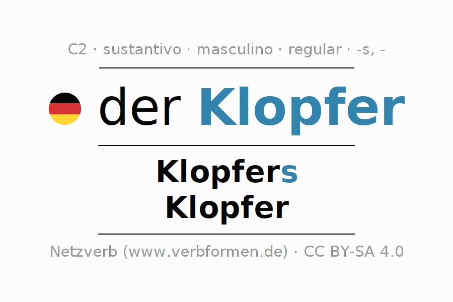 La declinación del sustantivo en forma de tabla con todas su formas: singular, plural y en los cuatro casos: nominativo (primer caso), genitivo (segundo caso), dativo (tercer caso) y acusativo (cuarto caso). Las construcciones gramaticales están representadas de forma clara en una tabla sinópica. La inflexión de los sustantivos es una ayuda durante tareas, exámenes, para cursos de alemán, la universidad, el estudio del alemán como lengua extranjera o como segundo idioma y para estudiantes adultos. La declinación correcta de las palabras es especialmente importante para los que aprenden el idioma alemán. Aquí encontraras más información acerca del tema Wiktionary Klopfer y aquí también a través del Duden Klopfer.