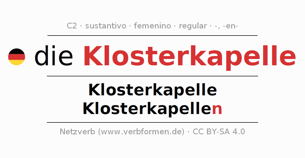 La declinación del sustantivo en forma de tabla con todas su formas: singular, plural y en los cuatro casos: nominativo (primer caso), genitivo (segundo caso), dativo (tercer caso) y acusativo (cuarto caso). Las construcciones gramaticales están representadas de forma clara en una tabla sinópica. La inflexión de los sustantivos es una ayuda durante tareas, exámenes, para cursos de alemán, la universidad, el estudio del alemán como lengua extranjera o como segundo idioma y para estudiantes adultos. La declinación correcta de las palabras es especialmente importante para los que aprenden el idioma alemán. Aquí encontraras más información acerca del tema Wiktionary Klosterkapelle y aquí también a través del Duden Klosterkapelle.