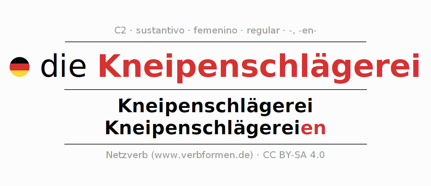 La declinación del sustantivo en forma de tabla con todas su formas: singular, plural y en los cuatro casos: nominativo (primer caso), genitivo (segundo caso), dativo (tercer caso) y acusativo (cuarto caso). Las construcciones gramaticales están representadas de forma clara en una tabla sinópica. La inflexión de los sustantivos es una ayuda durante tareas, exámenes, para cursos de alemán, la universidad, el estudio del alemán como lengua extranjera o como segundo idioma y para estudiantes adultos. La declinación correcta de las palabras es especialmente importante para los que aprenden el idioma alemán. Aquí encontraras más información acerca del tema Wiktionary Kneipenschlägerei y aquí también a través del Duden Kneipenschlägerei.