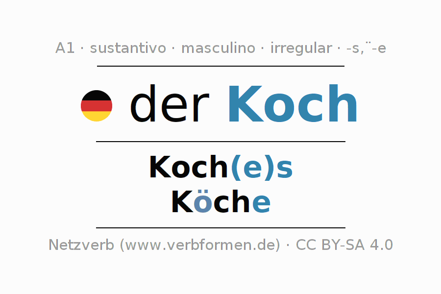 - Singular: der Koch, des Koch(e)s, dem Koch(e), den Koch