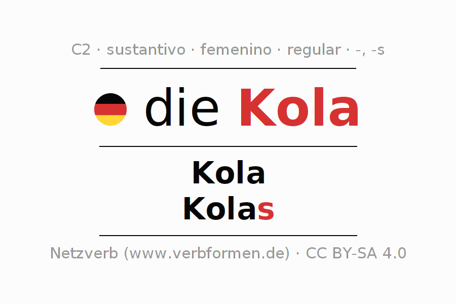 La declinación del sustantivoKola (bebida, nuez de cola) se encuentra en genitivoKola del singular y en el nominativoKolas del plural. El sustantivo Kola se conjuga de forma fuerte (irregular) con estas terminaciones -/s. El género gramatical de Kola es femenino y por eso se requiere el artículo definido ‘die’. Aquí puedes declinar no solamente Kola sino también todos los sustantivos alemanes . Este sustantivo pertenece al vocabulario necesario para pasar el examen "Zertifikat Deutsch" o para el nivel C2. Comentarios ☆