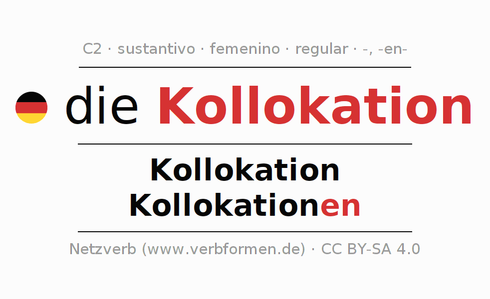 La declinación del sustantivoKollokation (colocación) se encuentra en genitivoKollokation del singular y en el nominativoKollokationen del plural. El sustantivo Kollokation se declina de forma débil con las terminaciones -/en. El género gramatical de Kollokation es femenino y por eso se requiere el artículo definido ‘die’. Aquí puedes declinar no solamente Kollokation sino también todos los sustantivos alemanes . Este sustantivo pertenece al vocabulario necesario para pasar el examen "Zertifikat Deutsch" o para el nivel C2. Comentarios ☆