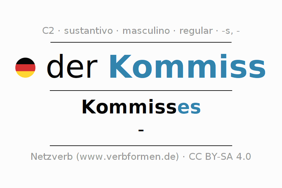 La declinación del sustantivo en forma de tabla con todas su formas: singular, plural y en los cuatro casos: nominativo (primer caso), genitivo (segundo caso), dativo (tercer caso) y acusativo (cuarto caso). Las construcciones gramaticales están representadas de forma clara en una tabla sinópica. La inflexión de los sustantivos es una ayuda durante tareas, exámenes, para cursos de alemán, la universidad, el estudio del alemán como lengua extranjera o como segundo idioma y para estudiantes adultos. La declinación correcta de las palabras es especialmente importante para los que aprenden el idioma alemán. Aquí encontraras más información acerca del tema Wiktionary Kommiss y aquí también a través del Duden Kommiss.