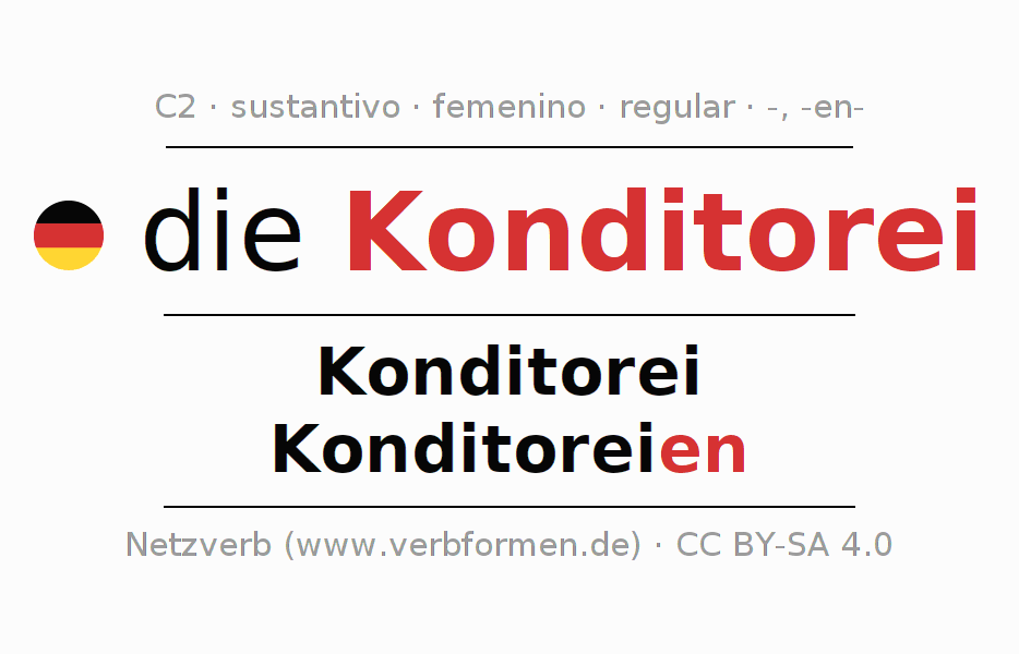 La declinación del sustantivo en forma de tabla con todas su formas: singular, plural y en los cuatro casos: nominativo (primer caso), genitivo (segundo caso), dativo (tercer caso) y acusativo (cuarto caso). Las construcciones gramaticales están representadas de forma clara en una tabla sinópica. La inflexión de los sustantivos es una ayuda durante tareas, exámenes, para cursos de alemán, la universidad, el estudio del alemán como lengua extranjera o como segundo idioma y para estudiantes adultos. La declinación correcta de las palabras es especialmente importante para los que aprenden el idioma alemán. Aquí encontraras más información acerca del tema Wiktionary Konditorei y aquí también a través del Duden Konditorei.