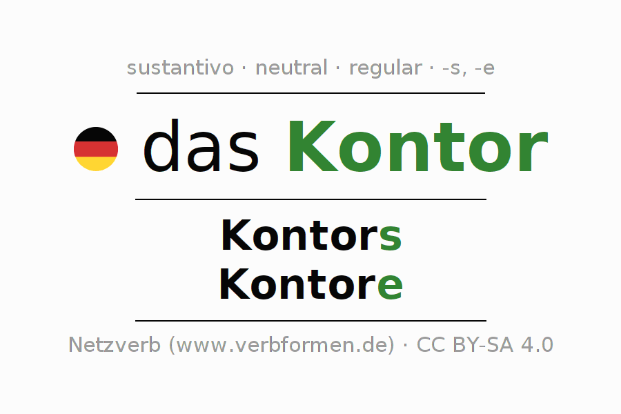 La declinación del sustantivoKontor (oficina, sucursal) se encuentra en genitivoKontors del singular y en el nominativoKontore del plural. El sustantivo Kontor se conjuga de forma fuerte (irregular) con estas terminaciones s/e. El género gramatical de Kontor es neutro y por eso se requiere el artículo definido ‘das’. Aquí puedes declinar no solamente Kontor sino también todos los sustantivos alemanes . Comentarios ☆