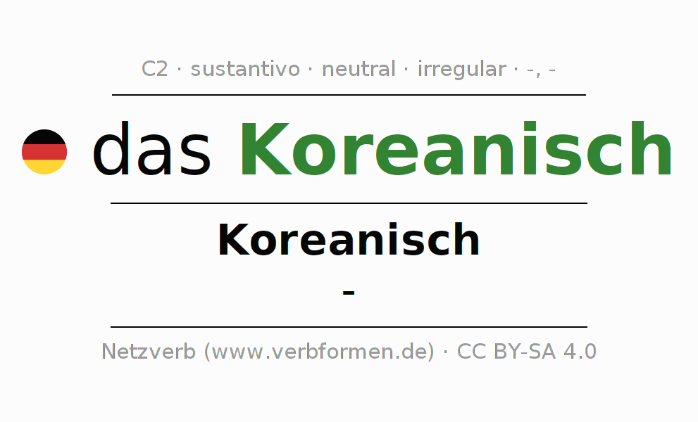 La declinación del sustantivoKoreanisch (coreano) se encuentra en genitivoKoreanisch del singular y en el nominativo- del plural. El sustantivo Koreanisch se declina con las terminaciones -/-. No permite construcciones en plural. El género gramatical de Koreanisch es neutro y por eso se requiere el artículo definido ‘das’. Aquí puedes declinar no solamente Koreanisch sino también todos los sustantivos alemanes . Este sustantivo pertenece al vocabulario necesario para pasar el examen "Zertifikat Deutsch" o para el nivel C2. Comentarios ☆